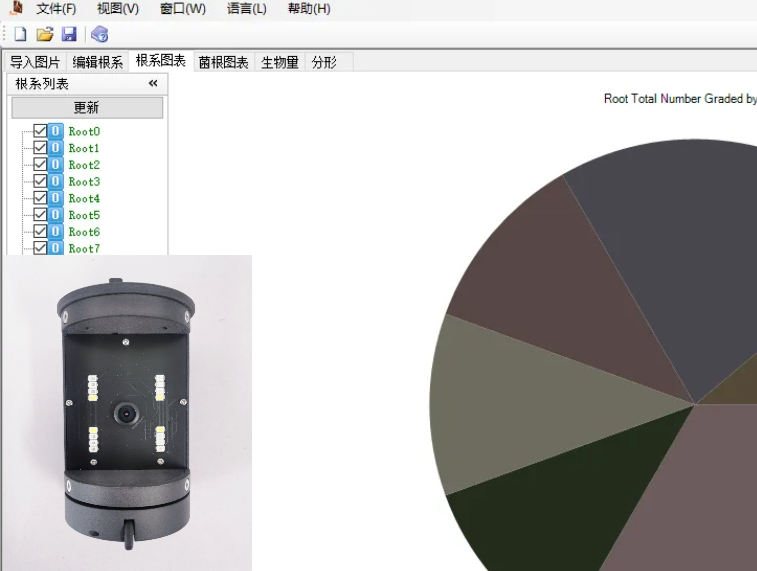 18.根系參數(shù)測定包含根拓撲參數(shù)測定、根系長度、起始直徑、結(jié)束直徑、平均直徑、體積、表面積、分支結(jié)構(gòu)、根系生長速率、根系壽命等參數(shù);功能上具有RHS UCL彩色模式、豐富快捷鍵、多語言模式、信息編輯、輔助標定等功能;